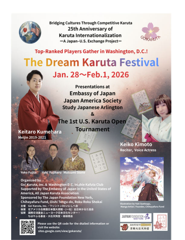 For those who cannot attend the Karuta session on January 28 at the library, there will be another opportunity to see the Karuta presentation on Sunday, February 1st at the Embassy of Japan.
