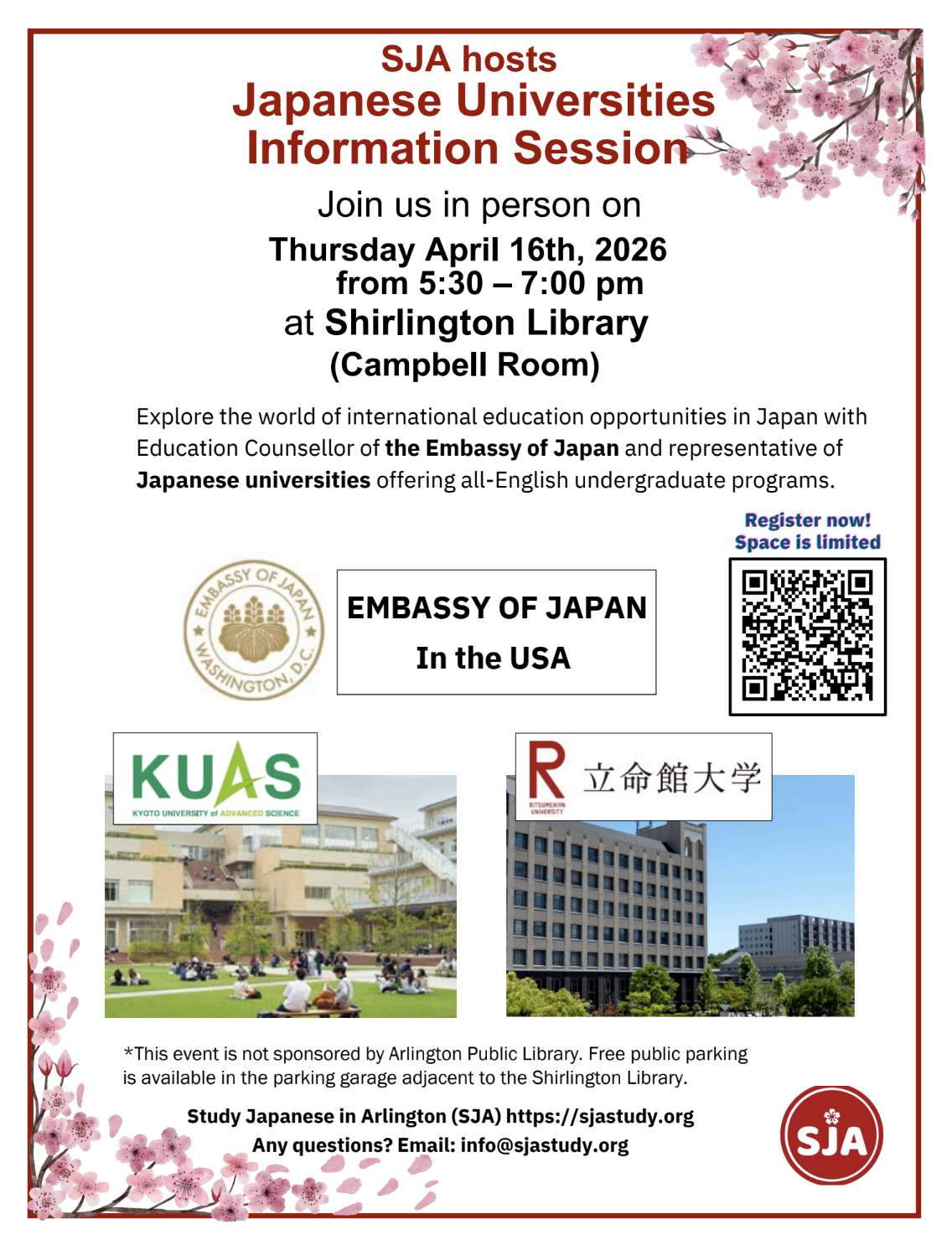 Join us for an informative and engaging session in collaboration with the Embassy of Japan, where we’ll explore the world of international education opportunities in Japan. Learn about attractive Japanese government-led initiatives directly from the Education Counsellor of the Embassy of Japan! Discover appealing opportunities at innovative universities like Kyoto University of Advanced Science (KUAS) and Ritsumeikan University, where you can study in English and earn a bachelor’s degree at an affordable tuition. Please register to attend this session from the QR code or the event page on our website!