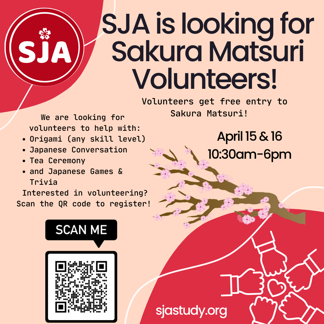 SJA is thrilled to be hosting our first booth at Sakura Matsuri! We are looking for volunteers to help with tea ceremony, origami, kids games and Speak Japanese corner! Volunteering for us gets your free entry into the Matsuri. Please sign up using this link or the QR code below.